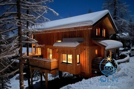 Maison de vacances traditionelle en bois, décor haut de gamme pour 8 personnes.