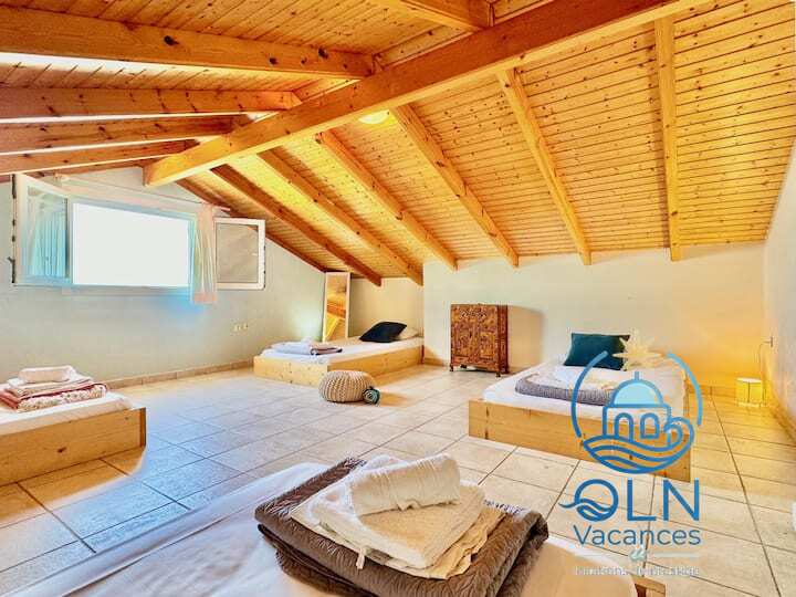 Doté de plafonds avec poutres apparentes (hauteur réduite), de lits bas de style futon et accessible par un escalier en colimaçon, cet étage est particulièrement adapté aux enfants et adolescents.