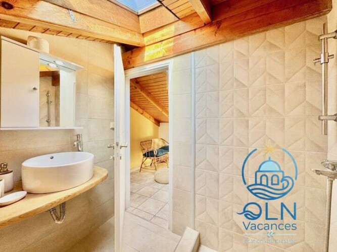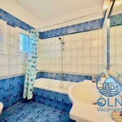 Au rez-de-chaussée se trouvent également 2 chambres, une chambre double et une chambre à lits jumeaux, partageant une salle de bain avec baignoire + douche.Un escalier mène au premier étage.