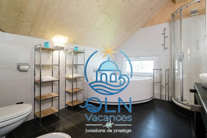 Au 1er étage, vous trouverez 4 chambres, des toilettes et une autre salle de bains très luxueuse avec double vasque, douche et baignoire avec jets. Il y a aussi des toilettes et un bidet. Dans la chambre avec 2 lits superposés, il y a une Playstation avec écran de télévision.