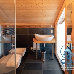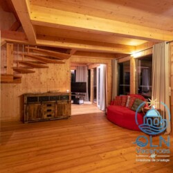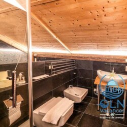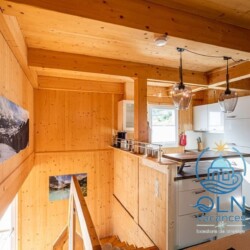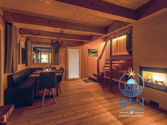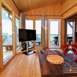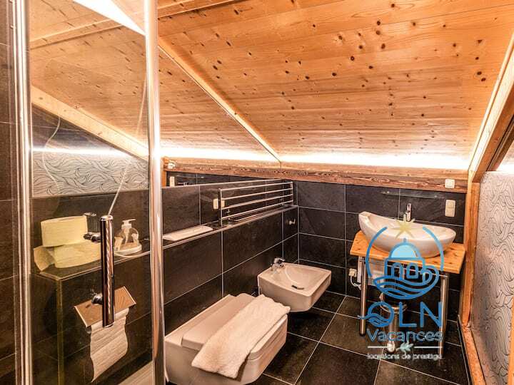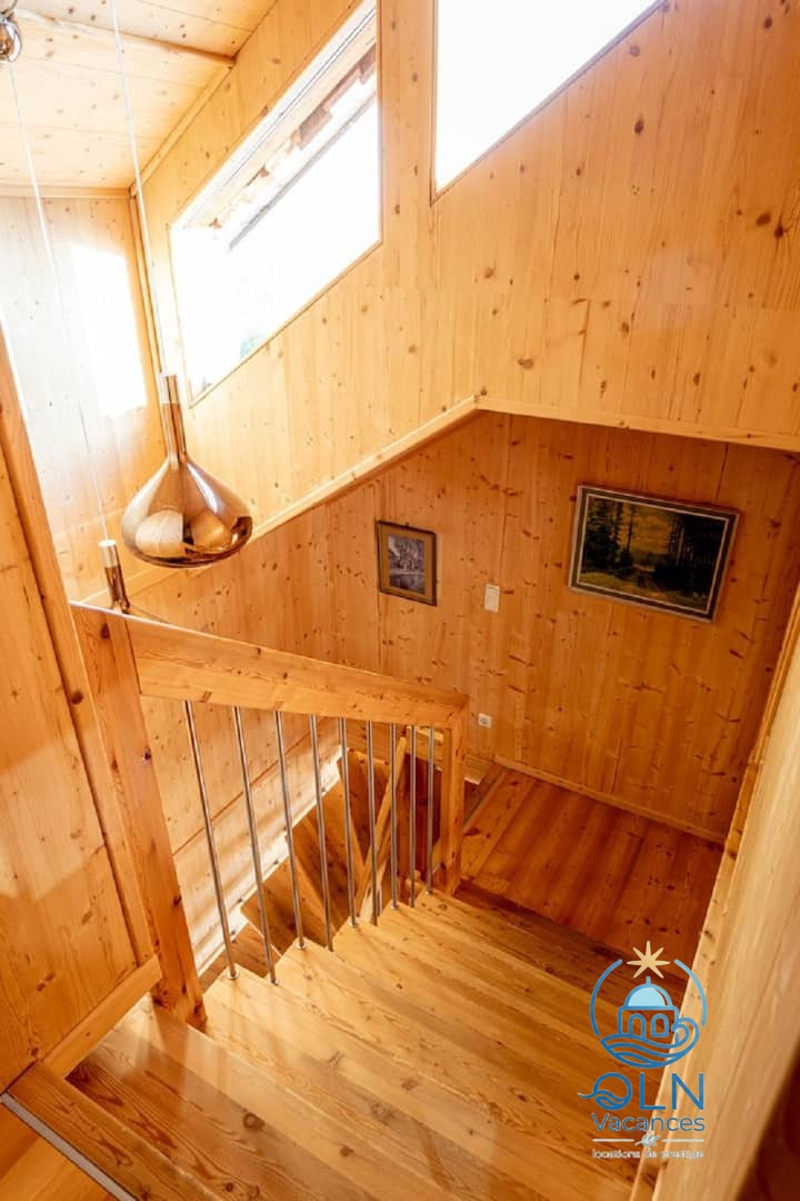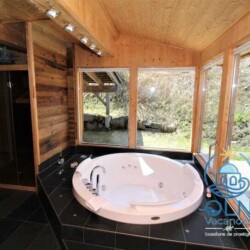Bain/douche, WC séparé, balnéo, Sauna. À l’étage inférieur: grand séjour/salle à manger ouvert avec baie vitrée avec table pour les repas, TV (satellite), Télévision numérique et poêle à gaz.