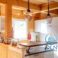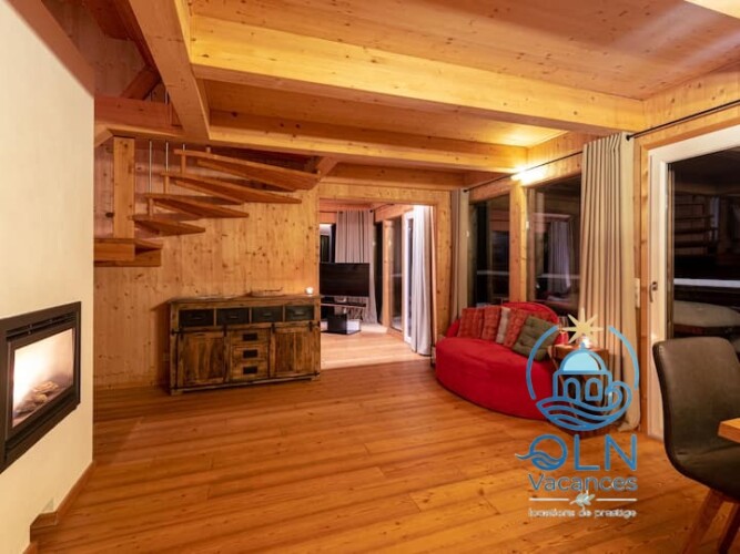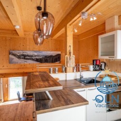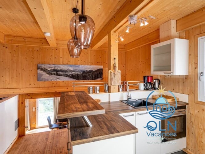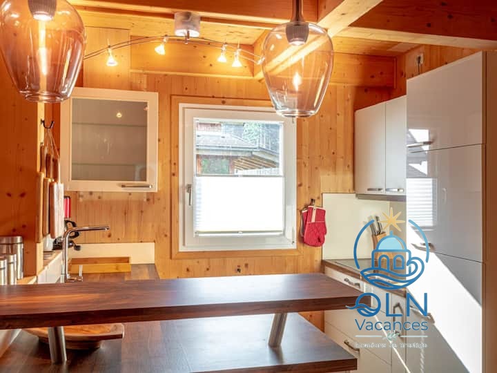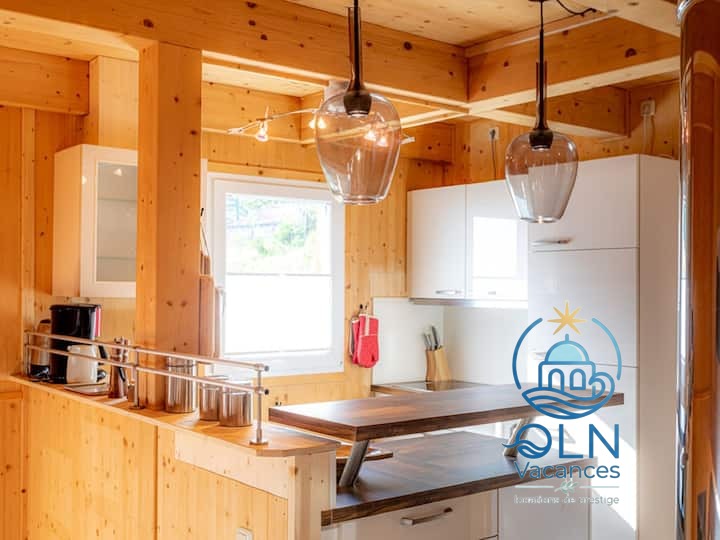 Spacieux, partiellement mansardé, aménagement luxueux et de bon goût: cuisine ouverte (four, lave-vaisselle, 4 plaques à induction, bouilloire électrique, congélateur, cafetière électrique) avec petite bar.