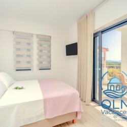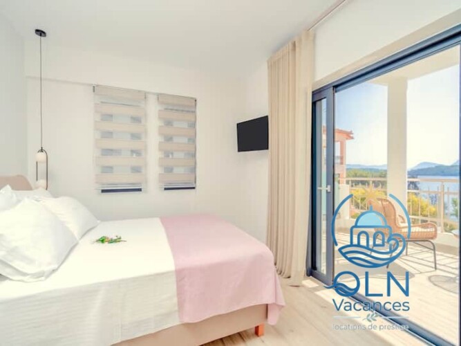 L’une des chambres dispose d’un lit double et de terrasses privées meublées surplombant la mer Ionienne d’un bleu profond.