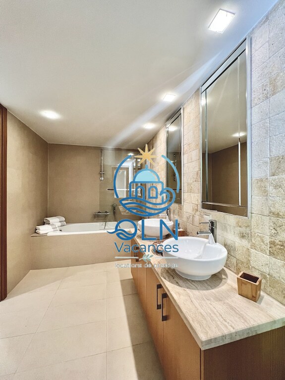 À votre arrivée dans cette location avec 5 chambres et 4 salles de bain, vous trouverez également un salon, un coin salle à manger, un canapé-lit et l’air conditionné.