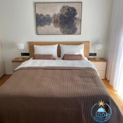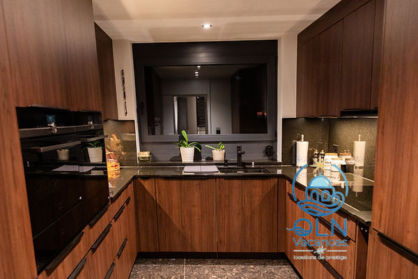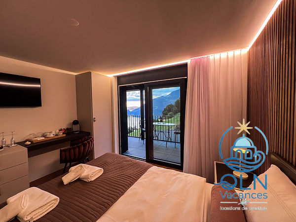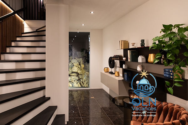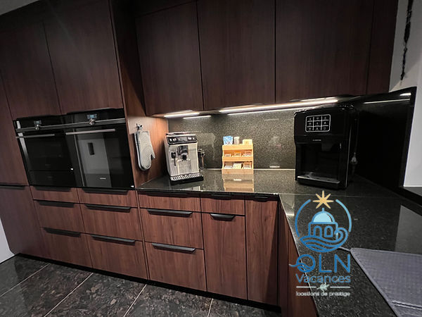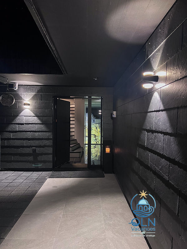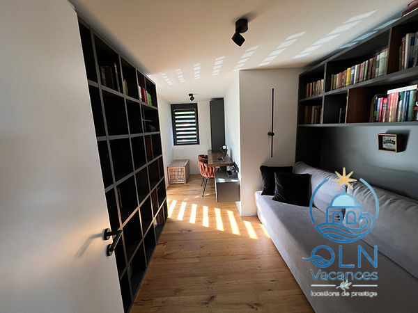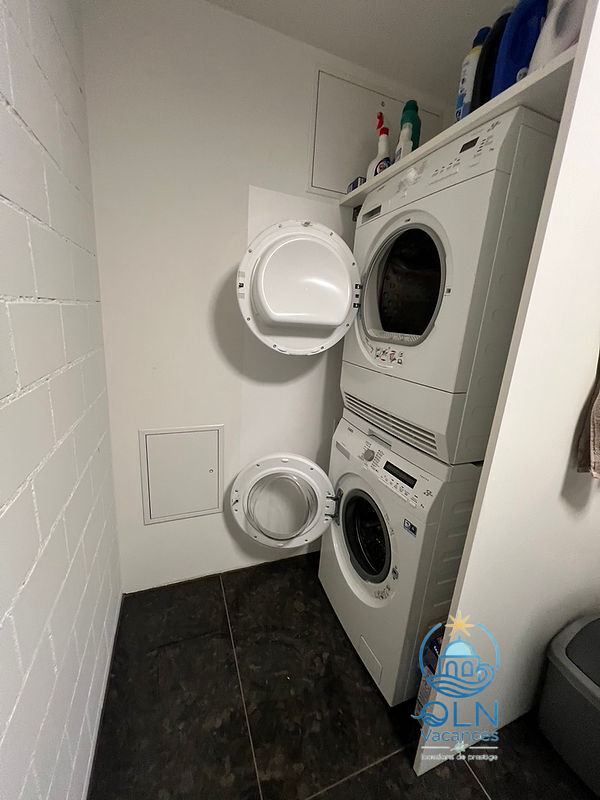 Sortie sur la terrasse. 1 chambre avec 1 grand-lit, bain/WC et TV. 1 chambre avec 1 grand-lit, douche/WC et TV.Bureau avec 1 divan-lit.Cuisine (four, lave-vaisselle, 4 plaques à induction, grille-pain, bouilloire électrique, congélateur, cafetière électrique, four à vapeur, combiné micro-ondes).WC séparé. À l’étage supérieur: 1 chambre avec 1 grand-lit et TV. 1 chambre avec 1 grand-lit et TV. 1 chambre avec 1 grand-lit et TV.Bain/douche/WC.Chauffage électrique, air-conditionné, chauffage par le sol. Énergie solaire. 3 balcons, terrasse 200 m2 partiellement couverte.