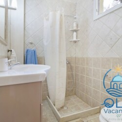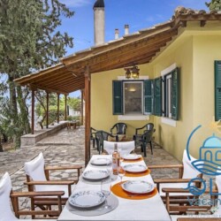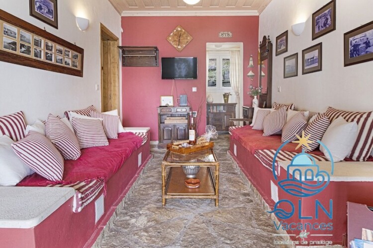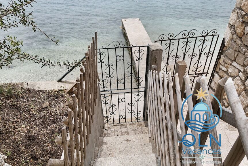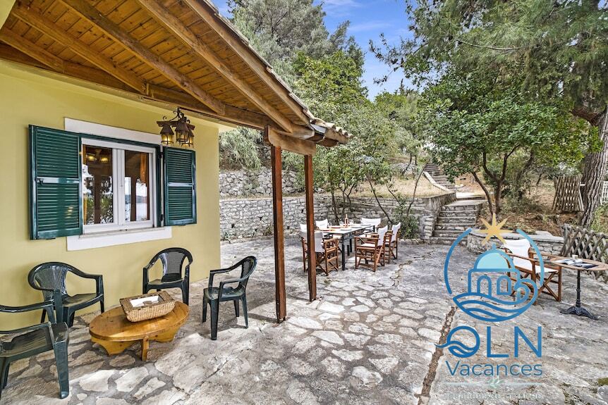 En haut de l’escalier, une maison d’été de trois chambres et deux salles de bains, située sur un terrain de 1050 m² dans le village de Perigiali.