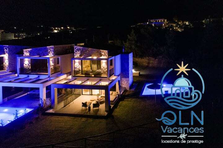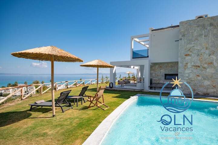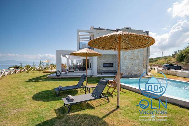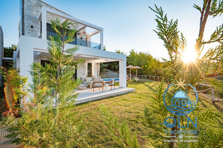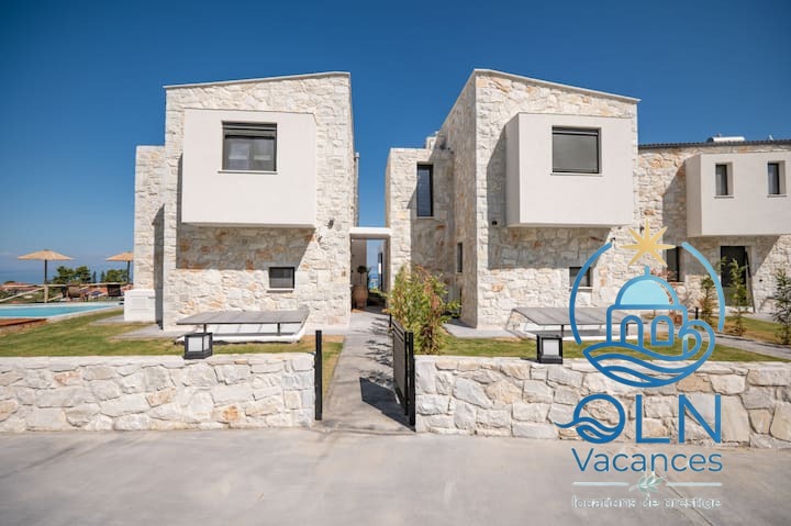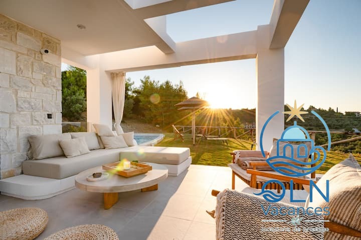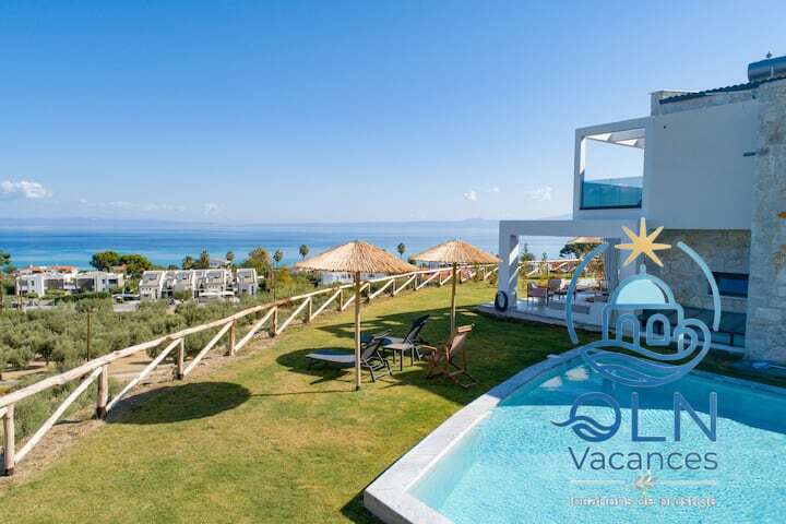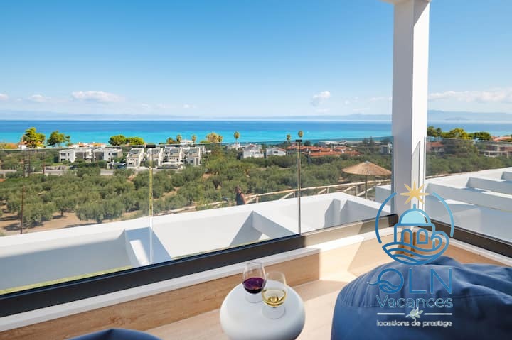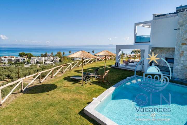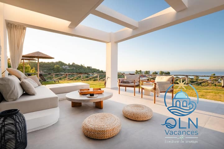 Villa Olive Grove Panorama n° 5 – Confort contemporain et vue panoramique sur la mer Perchée sur un paisible versant de colline dans la région de Chanioti, en Chalcidique, la Villa Olive Grove Panorama n° 5 fait partie d’un petit complexe de cinq villas exclusives.