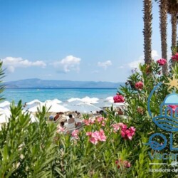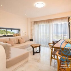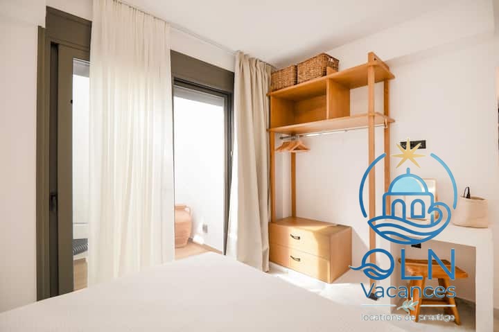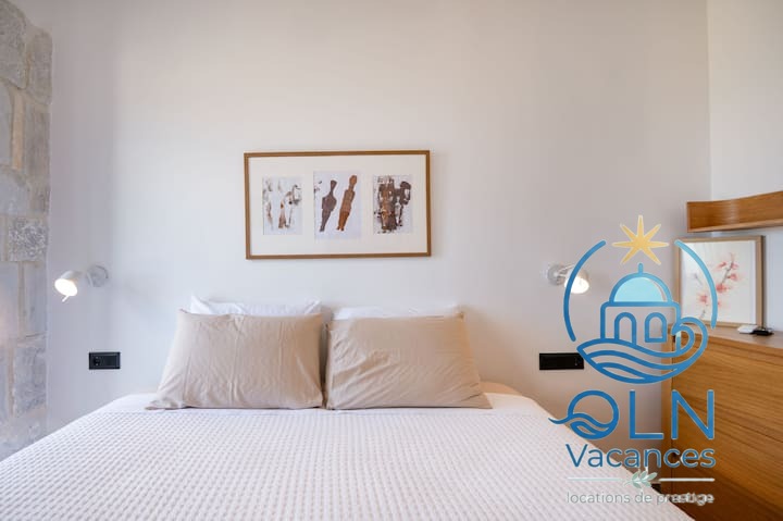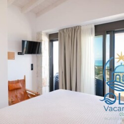 La vue panoramique, depuis le séjour comme depuis le jardin, est à couper le souffle : elle embrasse l’horizon de la mer Égée et la station balnéaire animée en contrebas.