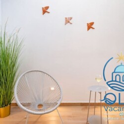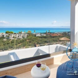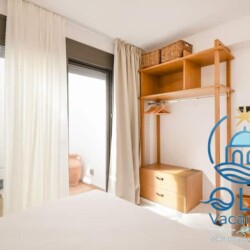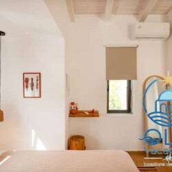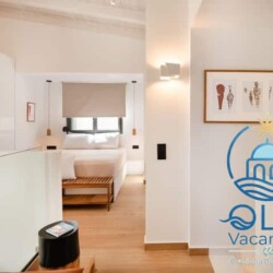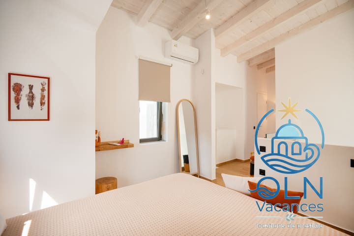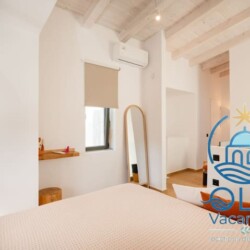 L’étage supérieur, conçu comme un appartement en duplex, comprend une chambre double avec une ouverture intérieure donnant sur le salon, une salle de douche familiale et une chambre parentale avec un balcon privé offrant une vue imprenable sur la mer et la baie.