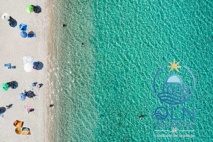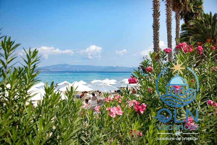 De larges portes-fenêtres s’ouvrent sur une véranda spacieuse et un jardin magnifiquement entretenu, où la piscine privée (4,00 x 7,50 m) semble se fondre dans la mer.