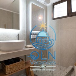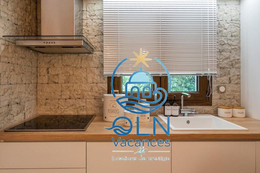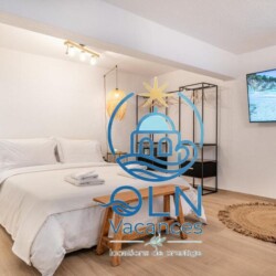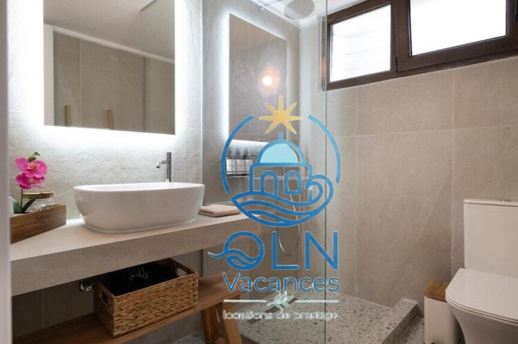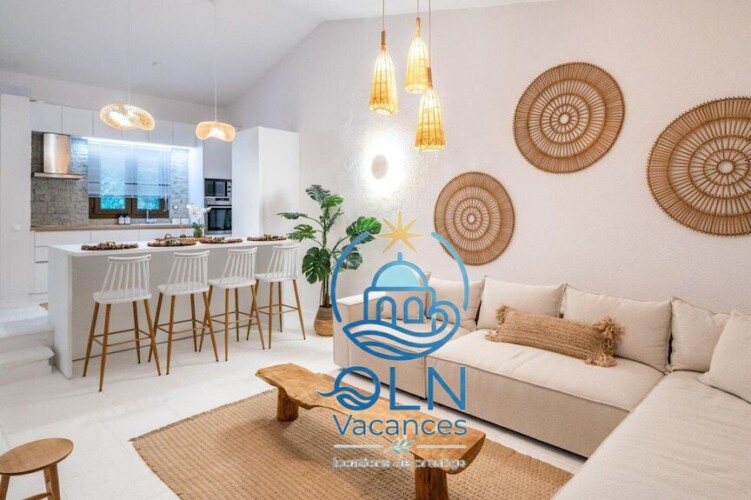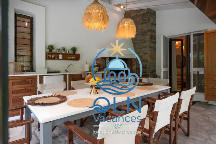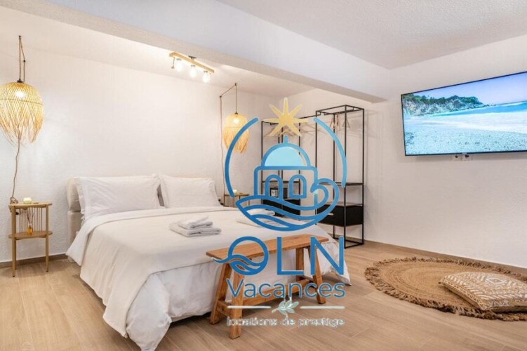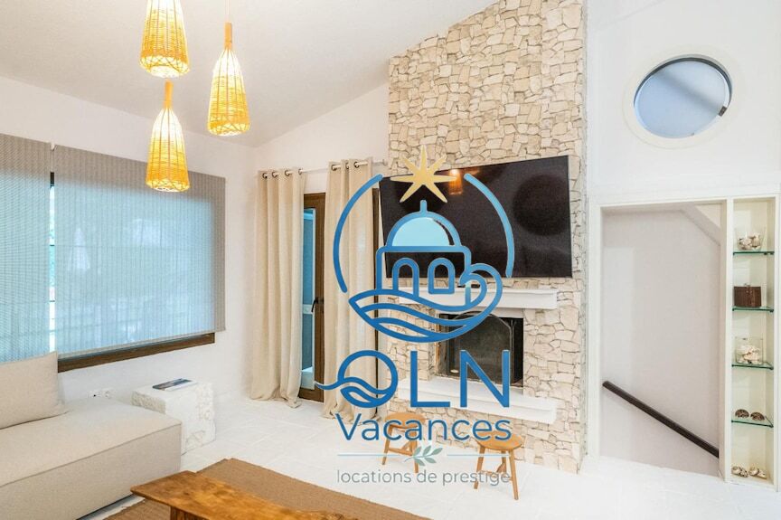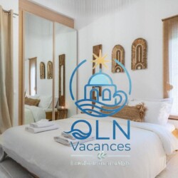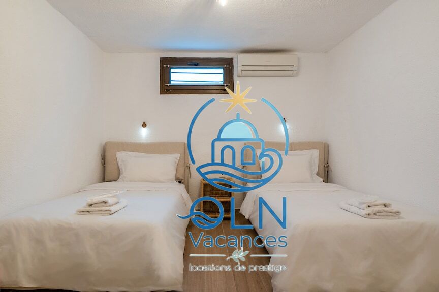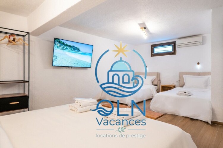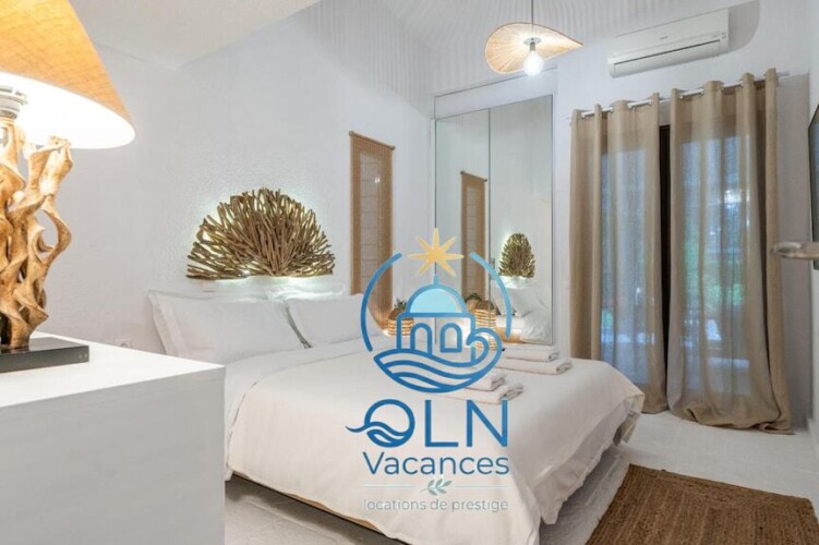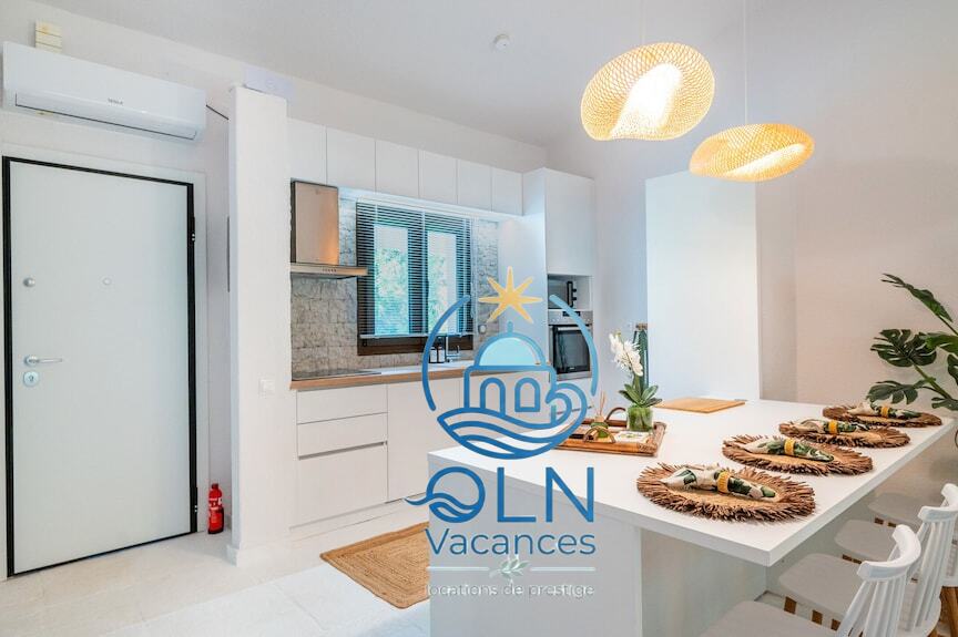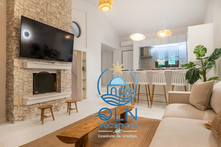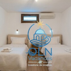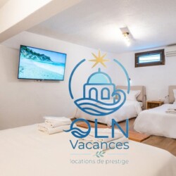 La villa se déploie sur trois niveaux pour répondre à tous vos besoins : • Niveau inférieur : lit queen-size, deux lits simples, salle de bain privée, idéal pour famille ou amis. • Niveau intermédiaire : cuisine ouverte entièrement équipée, séjour lumineux, deux chambres avec lits queen-size, salle de bain. • Niveau supérieur : espace bureau raffiné, canapé-lit, salle de bain, parfait pour travailler pendant les vacances.