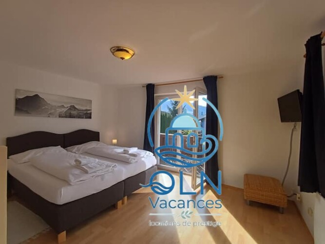 Une chambre dispose d’un balcon avec une vue panoramique imprenable sur les montagnes alpines et est équipée d’une télévision.
