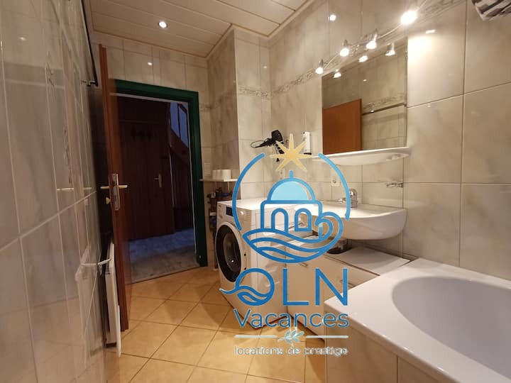 Il y a une salle de bain avec lave-linge, toilettes et baignoire également située au rez-de-chaussée.