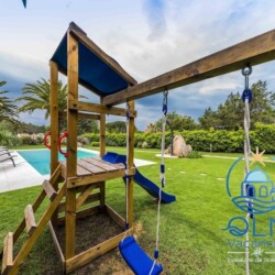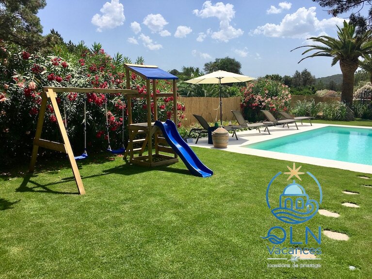 Nous avons également une nouvelle aire de jeux extérieure pour les enfants avec balançoires et toboggan, une belle maisonnette en bois.