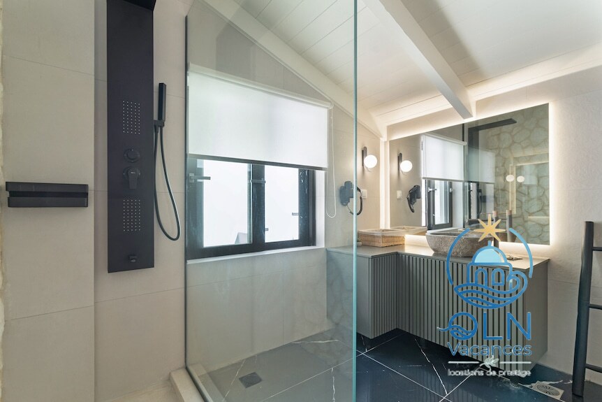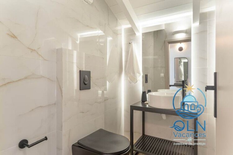 Sur 110 m², elle comprend un salon avec canapé-lit pour 2 personnes, une cuisine, 3 chambres, une salle de bain complète avec toilettes et douche, une salle d’eau et des toilettes séparées, pour un total de 8 personnes.