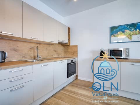 Cuisine ouverte (four, lave-vaisselle, 4 plaques vitrocéramiques, bouilloire électrique, micro-ondes, congélateur, cafetière électrique).