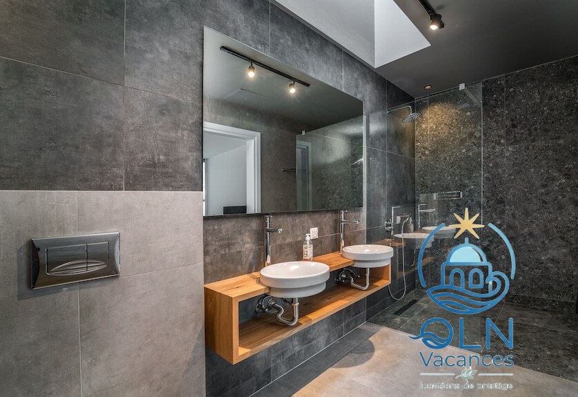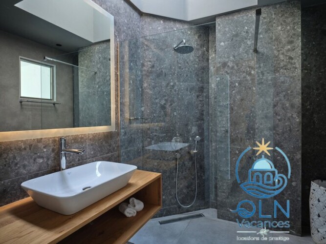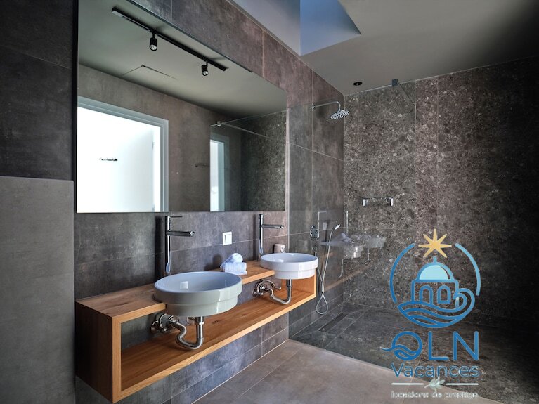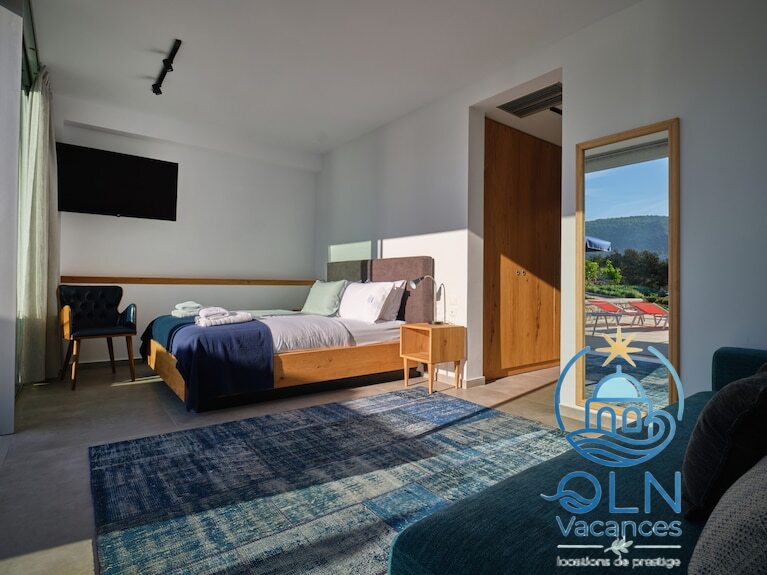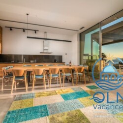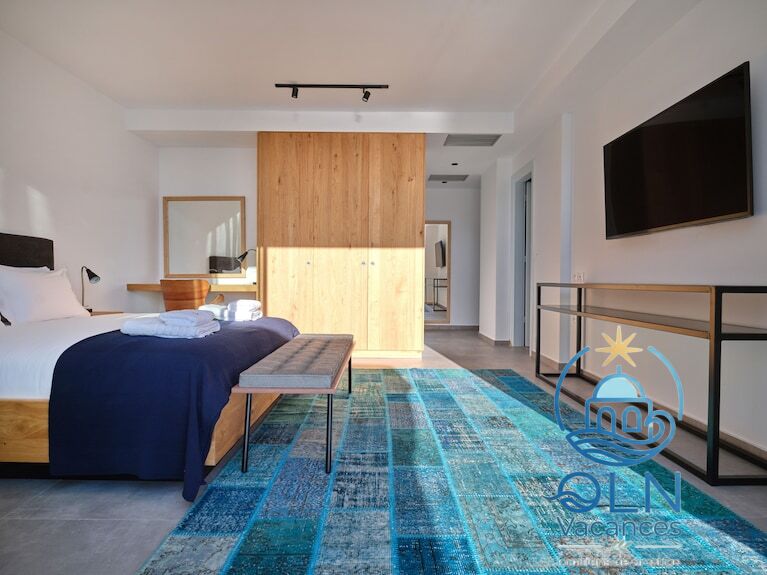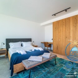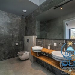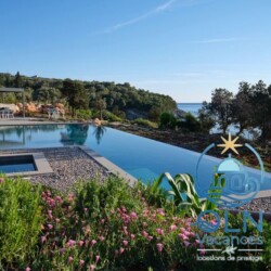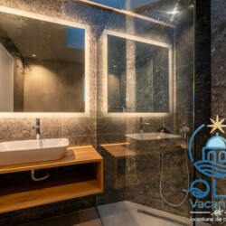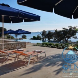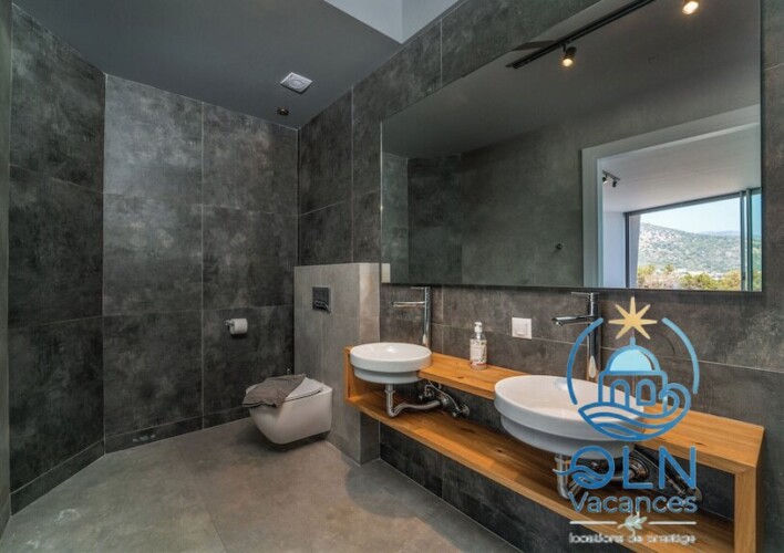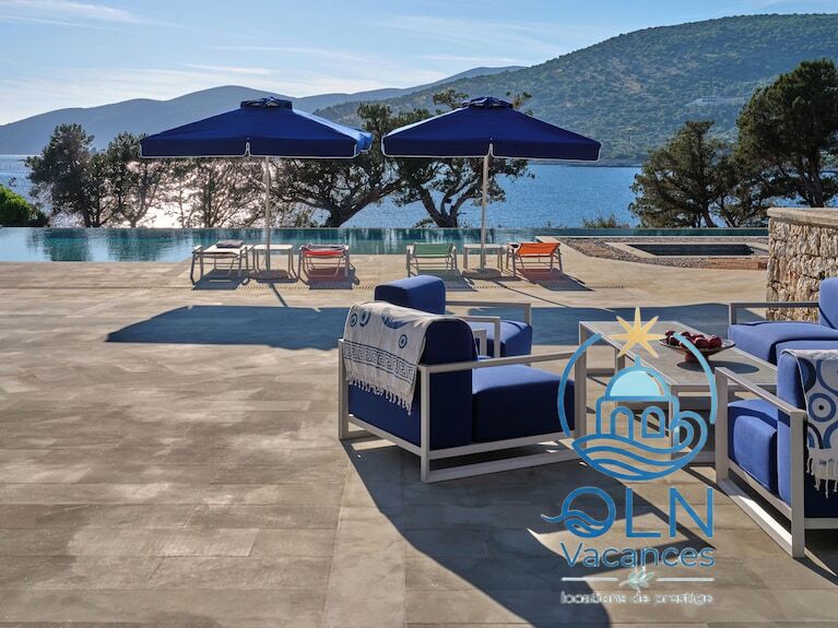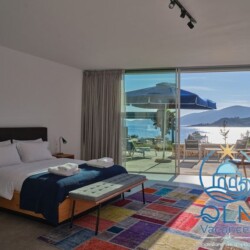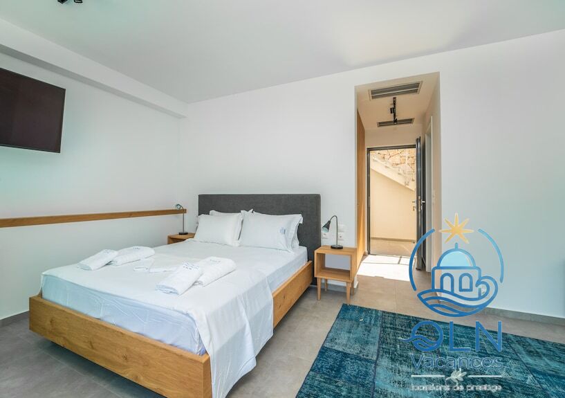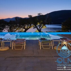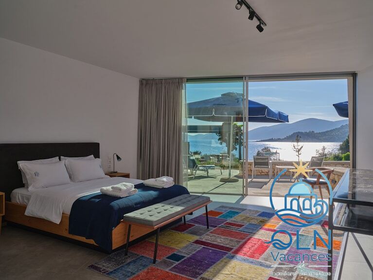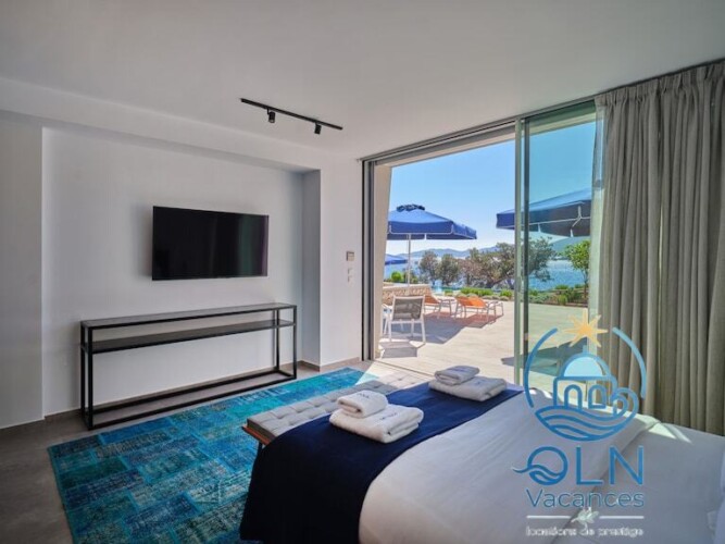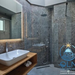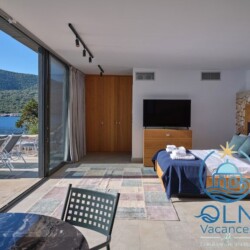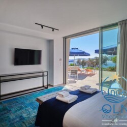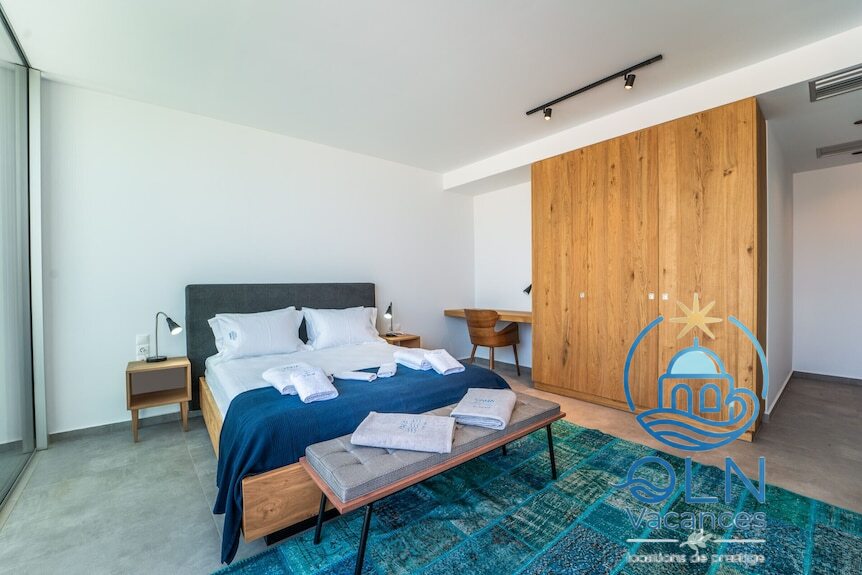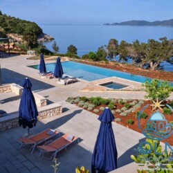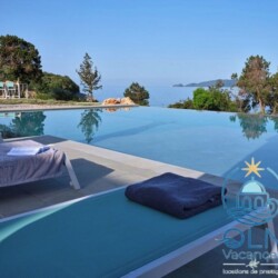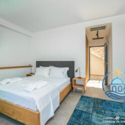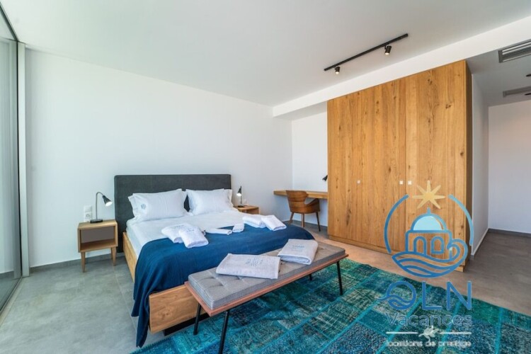 In the villa 5 suites with a double bed each with sea view and private balconies, and another smaller suite on the back side of the villa with 2 single beds. One of the bedrooms with the double bed, has also a sofa bed that can accommodate additionally 2 people.The villa is disabled friendly.